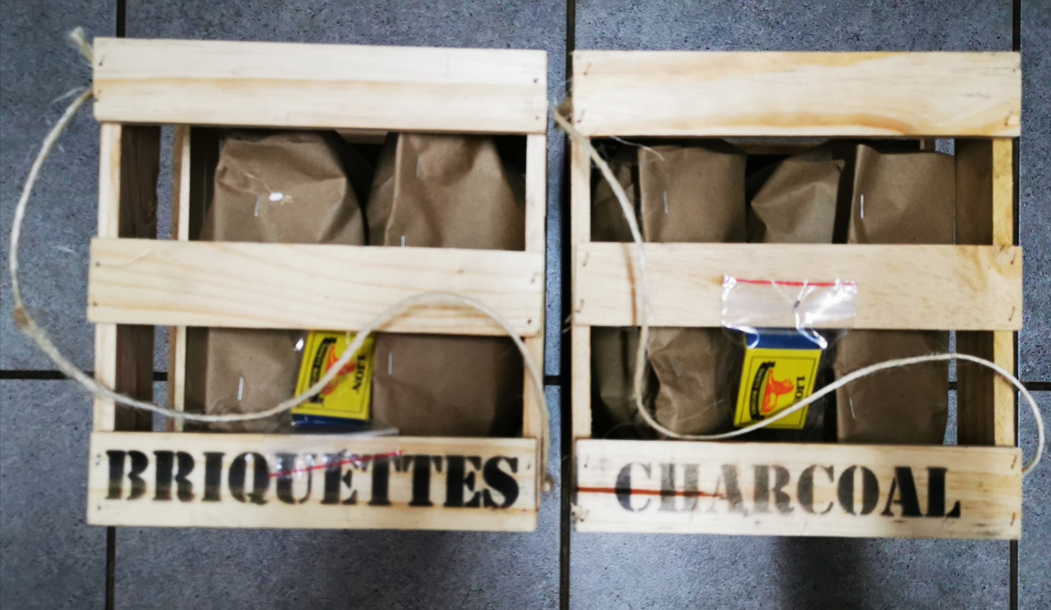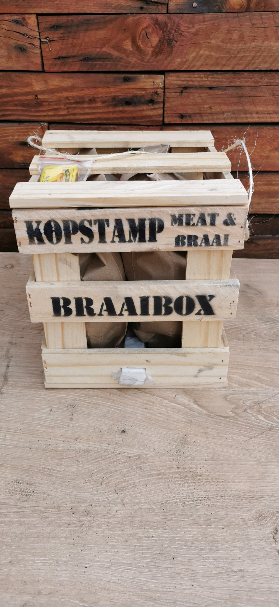 Braai Box is a NO MESS NO FUSS alternative to open, dirty, messy bags of charcoal/briquettes when you braai. Made with recycled pinewood. Two brownpaper bags filled with either Namibian hardwood charcoal or briquettes or with Sekelbos braai wood, your choice. Comes with firelighter and a box of matches. Easy, set it alight, let it burn and enjoy the BRAAI!!